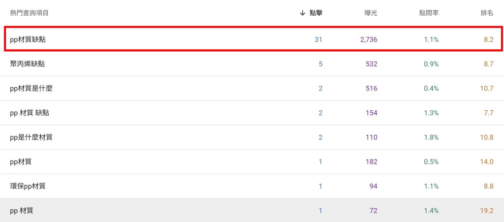 1. 「pp材質缺點」的平均排名從 7.1 提升到了 3.5,目前仍是流量最高的主力關鍵字。